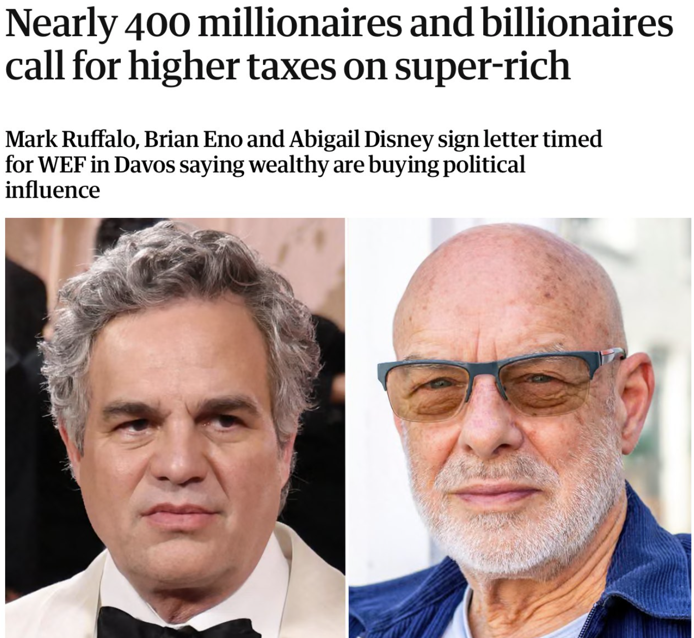 Maailma eri riikide ligi 400 miljonäri ja miljardäri on pöördunud avaliku kirjaga maailma juhtide poole, kutsudes üles suurendama superrikaste maksustamist, et pidurdada kasvavat ebavõrdsust ja kaitsta demokraatiat. Avalik kiri avaldati ajastatult World Economic Forum (WEF) kohtumisega Davosis.